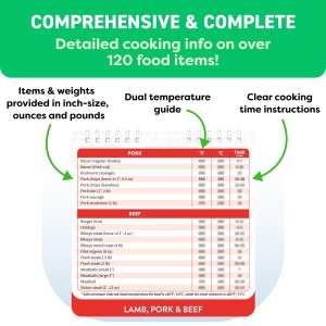 - Air fryer cooking times chart magnet, times and temp guide. Special sections include: tips & tricks, steak doneness prime rib cook temperature chart, safe minimum internal meat temps, vast Legumes & Vegetables section for vegans, and unique Bakery, Desserts & Snacks category.