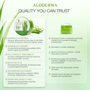 - Aloderma: We are a family run farm-to-face skin care line focused on producing and creating high-quality organic aloe vera-based products in an ecologically friendly way. We grow organic aloe vera on our own farms and manufacture all of our products in our factory, which are certified USDA and European Union organic by ECOCERT. Aloderma has over 20 years of working with Aloe providing high quality and affordable products for beauty, health and wellness.