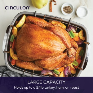 Details: The Circulon Nonstick Bakeware 17 inch by 13 inch Roaster with U-Rack makes it simple to create holiday roasts, family feasts, and more. With its convenient chrome-plated U-shaped rack, this oven roaster keeps meats off the bottom of the pan so unwanted fats drip away to the bottom of the roaster. The heavy-duty steel construction promotes balanced heat distribution for superior cooking performance and long-lasting durability while the nonstick roaster has rolled edges for extra strength. The oven roaster also features premium-quality nonstick for excellent food release and easy cleanup. Oven safe to 450 degree Fahrenheit, this big turkey roaster is a great way to create delicious meals. Roasting turkey, ham, roast beef, chicken and more is easier using the Circulon Bakeware 17 inch by 13 inch Nonstick Roaster with Rack.