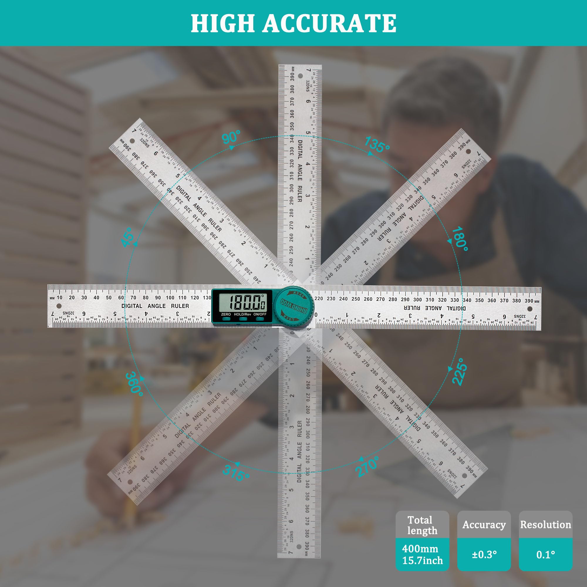 Accurate Reading – Standard,clear and precise 2 in 1 millimeter and inch scale. Angle Measuring Range:0~999.9°; Accuracy ±0.3°; Resolution 0.1°!