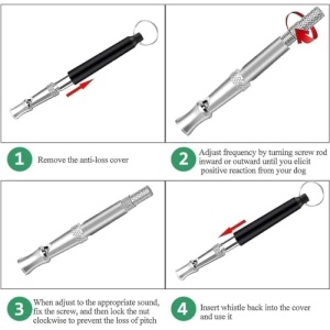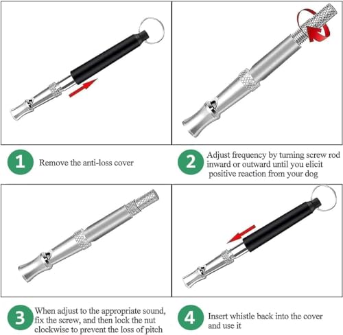 - 【HOW TO TRAIN YOUR DOG?】: Dog Whistle, different dogs respond to different frequencies. Dog training whistle has a nut and screw that would adjust thebfrequency when turned. Notice your dog’s reaction to each setting until your dog exhibits the strongest reaction. Please keep your whistle command consistent, when your dog does it right, give him a snack reward, approach to make your dog a listening and obedient friend.