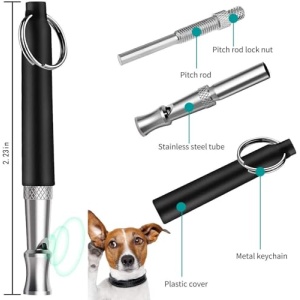 Details: Dog Whistle for Stop Barking, 2 Pack Professional Ultrasonic Dog Whistles Training Recall Dog, Adjustable Silent Dog Whistle Stop Barking Training Control Devices for Neighbors Dog,with Black Lanyard Package Include : 2 x Masterplug Dog Whistle, 2 x Lanyards Features: a. The whistles can be used for other animals, including cats, dog’s birds, etc. b. For dog owners to train, teach, and control their dogs. c. To distract irritating or dangerous dogs. d. Train your dog with different commands and get them to follow your instructions (sit, paw, lay down, up, Heal) How to train your dog with Masterplug dog whistle: Prepare some treats, lead your dog to a lawn, or somewhere quiet. Adjust the pitch and blow the whistle to train your dog, continue testing until your dog responds. Notice your dog’s reaction to each setting until your dog exhibits the strongest reaction. It is best to train 5-6 times per session, reward your dog with a treat If it responds positively. Some tips: “”Don’t move”” ——- Two short sounds, “”Sit down””——— one long and one short, “”Over””——— Two long sounds. For example : When teaching the sit-down action, first play the flute according to the prescribed method, then hold the dog’s buttock with your hand and let him sit down. In this way, repeat the training. Later, when the flute is played, the dog will sit down by himself.