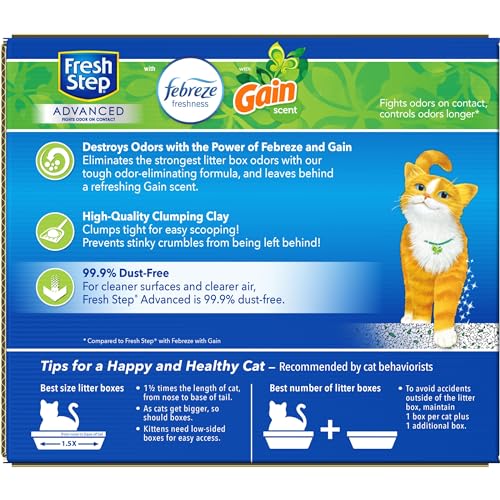 Details: Fresh Step Advanced Clumping Cat Litter guarantees 10 days of odor control and is available in the Gain Original scent that you love in a 99.9% dust-free formula. This advanced clumping cat litter with Ammonia Block Technology is our most advanced odor protection formula yet. Fresh Step Advanced cat litter starts fighting odors on contact to control odor longer (vs. Fresh Step Gain regular formula cat litter). Fresh Step Cat Litter uses the power of Febreze to block litter box odors with activated charcoal to guarantee 10 days of odor control. Made with a cat-friendly formula, this 99.9% dust-free formula helps keep surfaces cleaner and air clearer with your cats health and happiness in mind. A paw-activated Gain Original fragrance is released every time your cat uses the litter box, providing fresh scent as needed for your home. Certain trademarks used under license from Procter & Gamble Company or its affiliates.