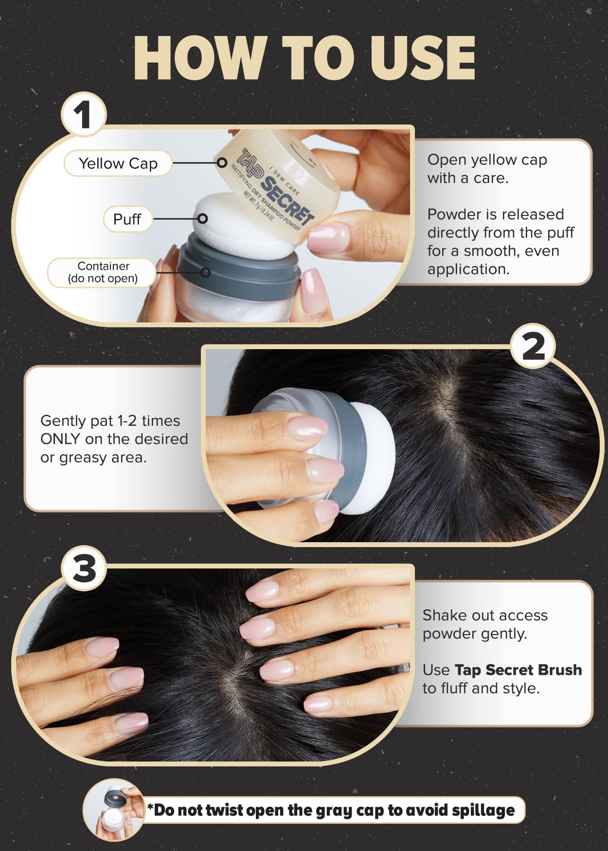 - ✅ NO MESS, NO STRESS: Embrace the beauty of simplicity with Tap Secret’s mess-free application. No hassle needed – just pat 2 to 3 times very gently on the desired area, shake out excess powder with ease, and tidy up your hair effortlessly. No mess, just pure perfection!