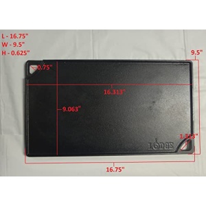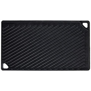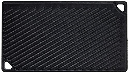 This double-burner Reversible Grill/Griddle functions as a dual cooking surface with both a smooth griddle and a ribbed grill. Fits over two stovetop burners. When used on the stove, set both burners to the same temperature for even cooking and excellent heat retention. Seasoned and ready to use. Features Seasoned with 100% natural vegetable oil Unparalleled heat retention and even heating Use in the oven, on the stove, on the grill, or over a campfire Get a restaurant-quality sear Use to sear, sauté, bake, broil, or grill Made in the USA Dimensions Length: 16.75 Height: 0.62 Weight: 9.35 Width: 9.5 Volume: 0.06 Fits: 8 eggs Great For: versatile use Cooking Surface Area: 146.25