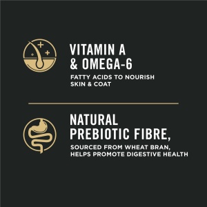 - Hard dog food with vitamin A and omega-6 fatty acids to nourish skin and coat