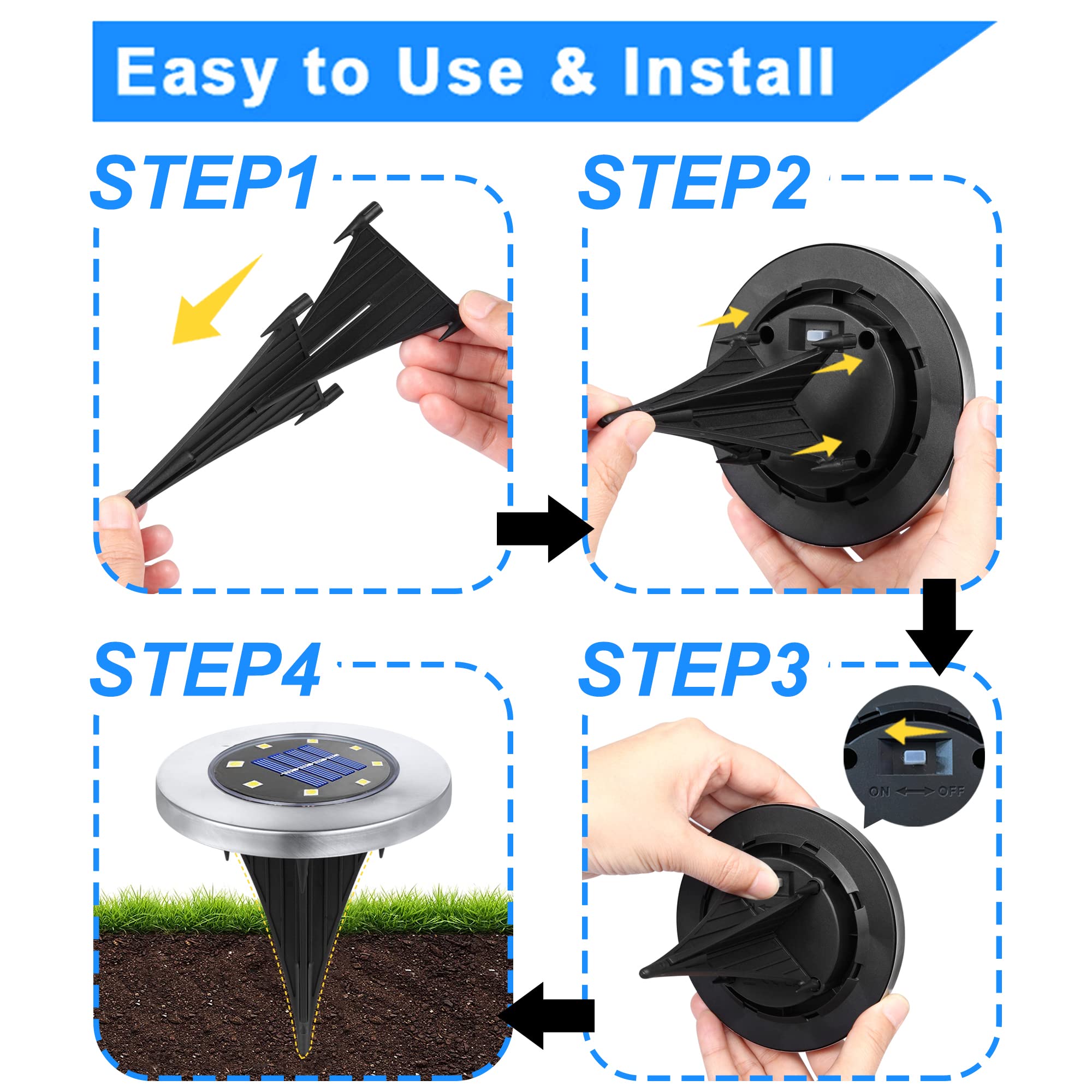 • 【Light up any place.】: Disk Lights provide perfect lighting for your courtyard, gardens, walkways, pathway, yard, driveway, lawns and corridors, etc. to add a beautiful night scene scene. Just place it where light is needed at night. No need to change cables or batteries, use free solar energy.