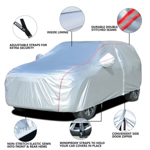 • 【Professional Design】1. unique door zipper on the driver’s side for quick and convenient access. 2. windproof straps & elastic hem at front and rear to protect your car cover from blown away by heavy wind. 3. equipped with combination lock, security anti-theft. 4. full-range reflective stripes remind others at night. 5. mirror pockets make the cover more suitable.